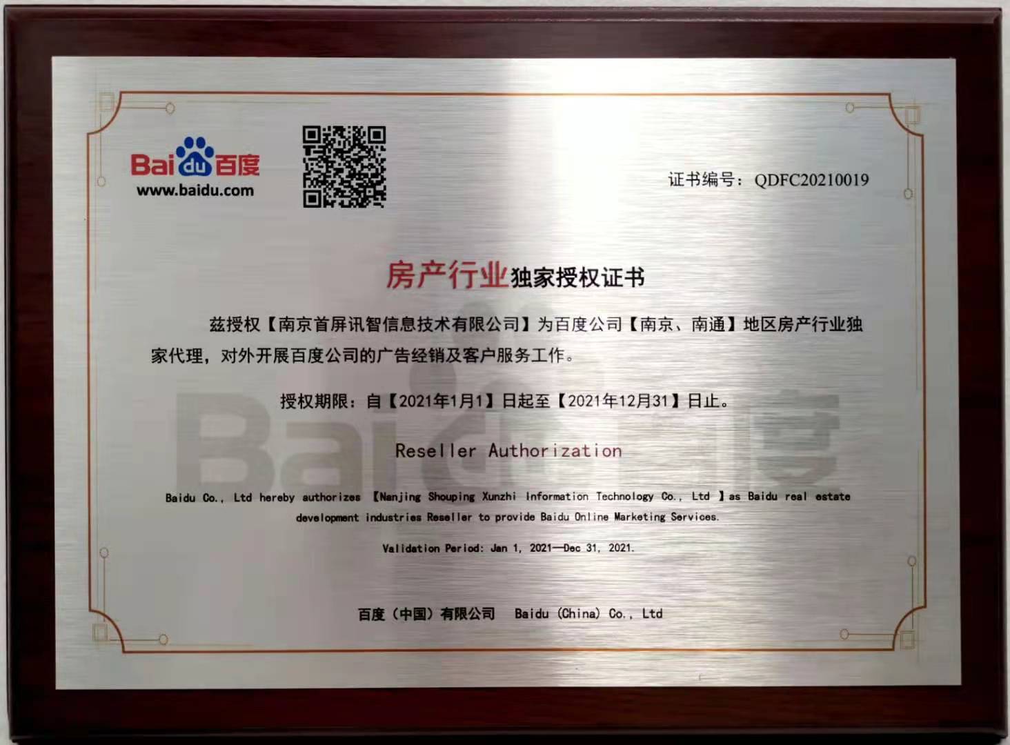 會上,百度公司正式授權(quán)南京首屏訊智信息技術(shù)有限公司為南京、南通地區(qū)房產(chǎn)行業(yè)獨家代理商及百度房產(chǎn)平臺南京、南通地區(qū)獨家運營商,并頒發(fā)授權(quán)證書。首屏訊智自2004年成為百度合作伙伴,始終致力于為廣大企業(yè)提供優(yōu)質(zhì)的互聯(lián)網(wǎng)營銷服務(wù)。擁有17年豐富互聯(lián)網(wǎng)行業(yè)服務(wù)經(jīng)驗的首屏訊智,已服務(wù)南京企業(yè)2萬余家,助力廣大企業(yè)快速穩(wěn)健發(fā)展。